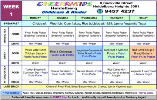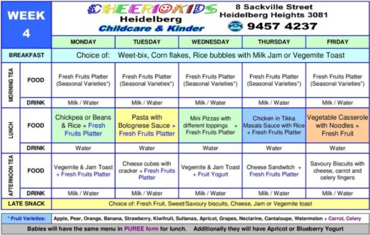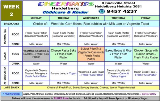 Our meals are prepared and cooked on-site. This consists of Morning Tea, Lunch, Afternoon Tea and Late snack. Our menus are as follows. Sometimes, some slight variations may occur. We also have recipes available at the centre for you.
